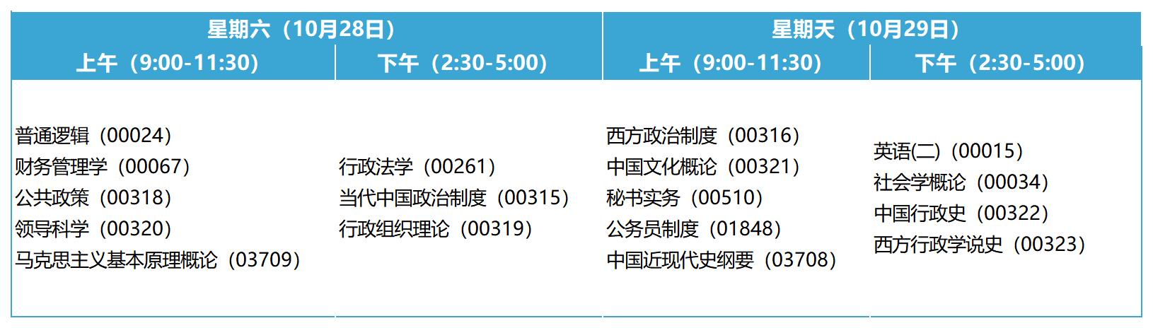 安徽自考本科行政管理專業(yè),專業(yè)代碼120402,2023年10月自考考試時(shí)間為10月28日-29日,上午9:00-11:30,下午14:30-17:00,本次考期共開考17門科目,具體科目安排如下: