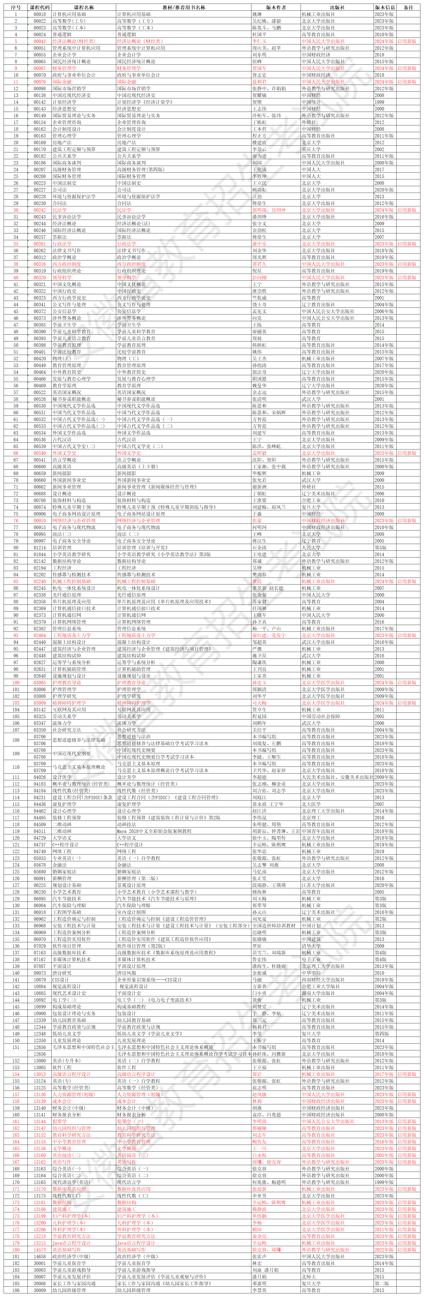 2024年10月安徽自考考試教材版本目錄