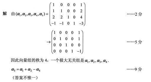 求向量組α1=(1,1,2,-1)T,α2=(0,1,2,-1)T,α3=(0,0,1,0)T,α4=(0,0,0,1)T,α5=(1,2,4,-3)T的秩和一個極大無關(guān)組,并把其余向量用該極大無關(guān)組線性表示.