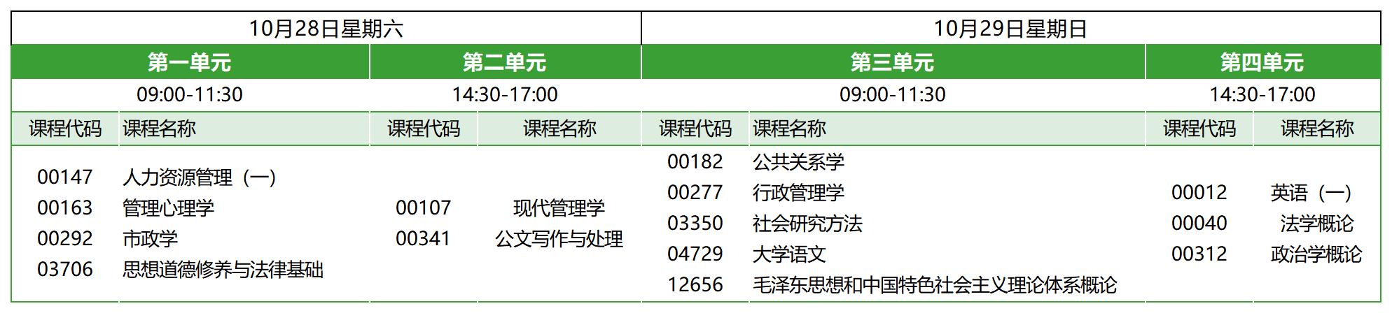 北京自考專科行政管理專業(yè),專業(yè)代碼01A0302,2023年10月自考考試時(shí)間為10月28日-29日,上午9:00-11:30,下午14:30-17:00,本次考期共開考14門科目,具體科目安排如下: