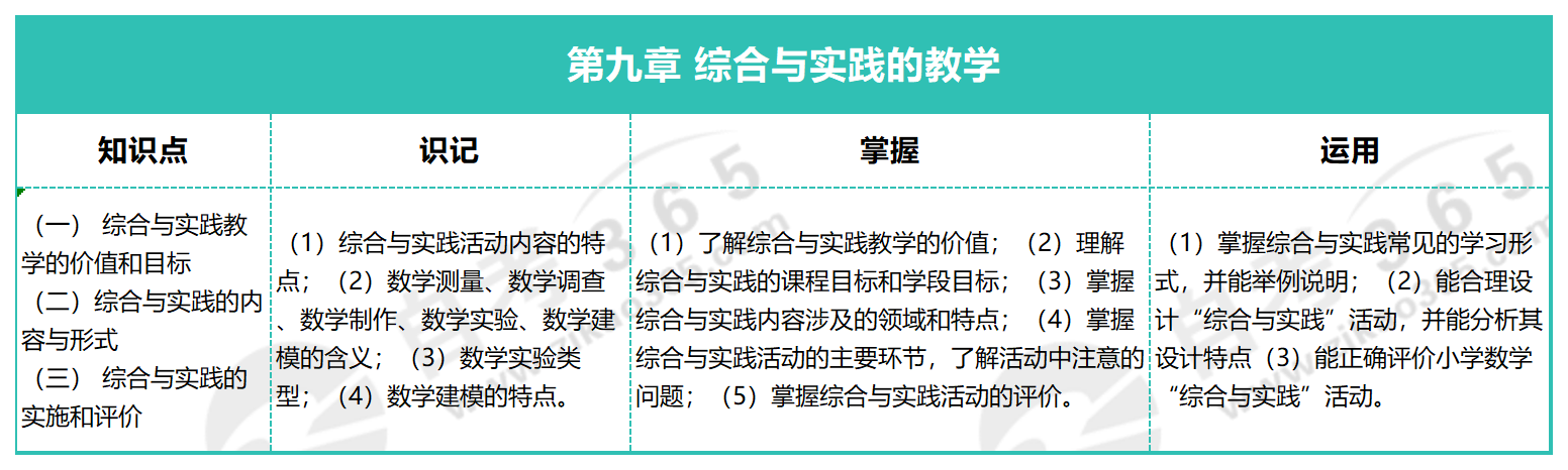 考生可參考下表開展復(fù)習(xí)。例如,記住“數(shù)學(xué)測量”、“數(shù)學(xué)實(shí)驗(yàn)”、“數(shù)學(xué)建模”等基本概念的定義,理解并掌握綜合與實(shí)踐活動(dòng)的相關(guān)注意事項(xiàng),并能靈活運(yùn)用、合理設(shè)計(jì)綜合與實(shí)踐活動(dòng),做出特點(diǎn)分析與論述。。