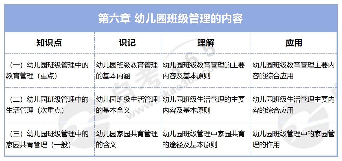 備考自考幼兒園班級管理,怎么復(fù)習(xí)才能提高效率?當然是按照考試大綱來學(xué)習(xí)!考試大綱中有明確表明不同知識點的考核要求——識記、理解、應(yīng)用。