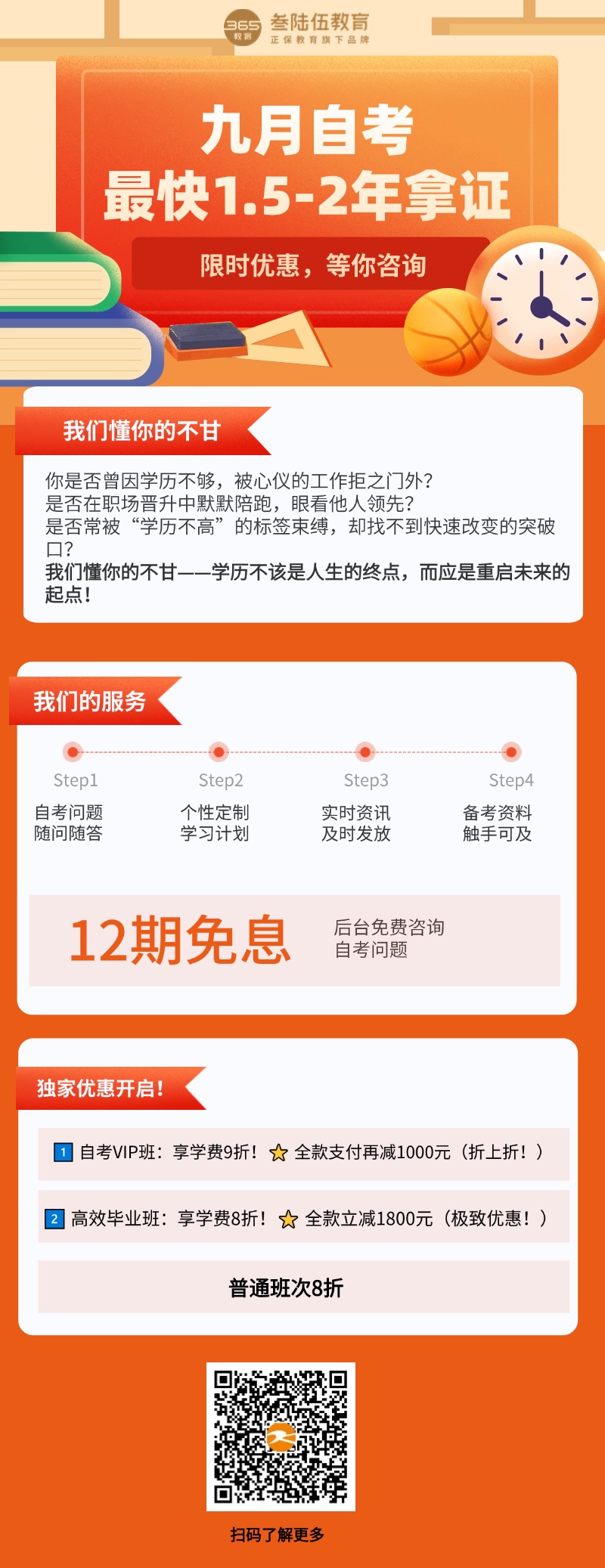 當前位置:首頁> 備考資料 > 九月自考,限時優(yōu)惠,等你咨詢!