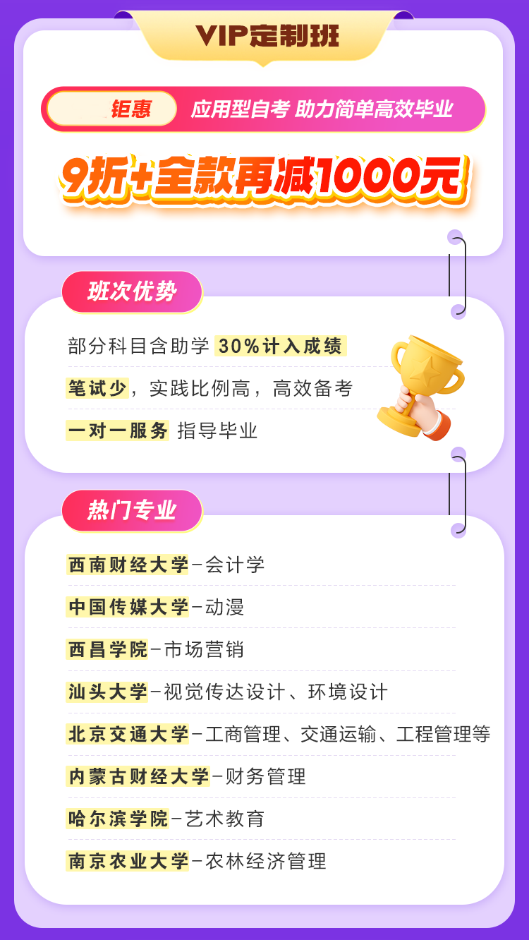 自考VIP班享9折優(yōu)惠,全款支付再減1000元。