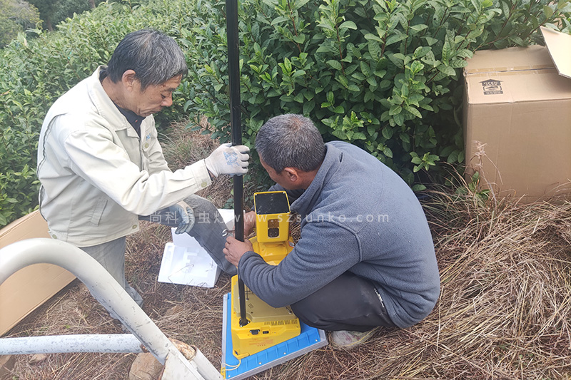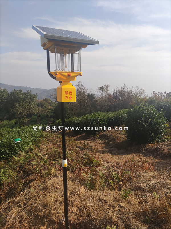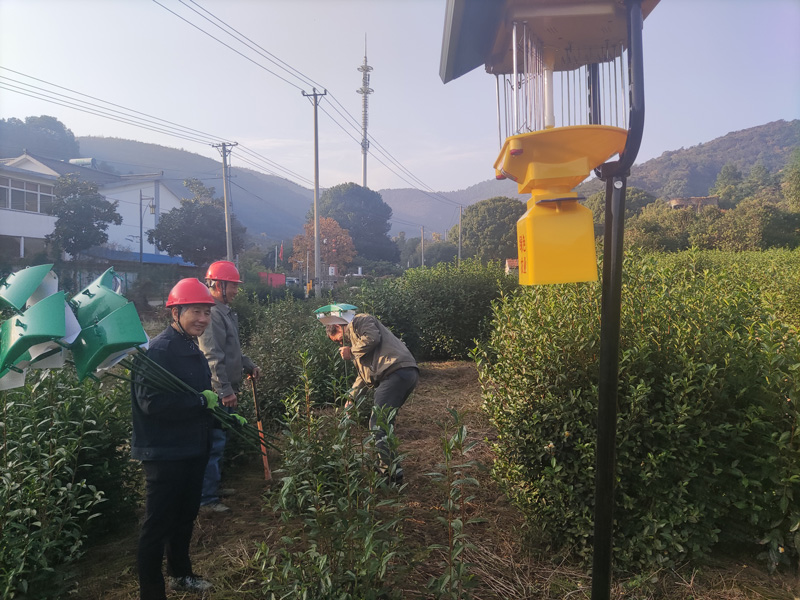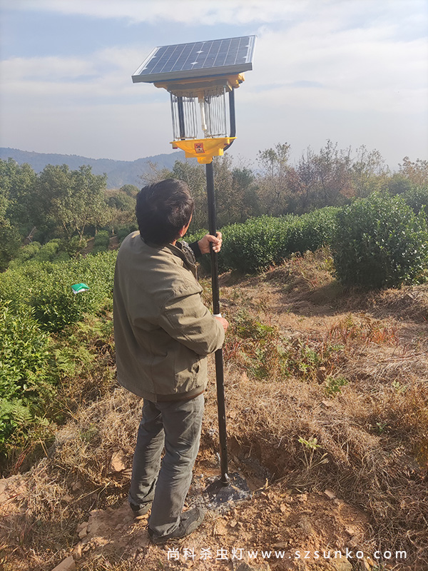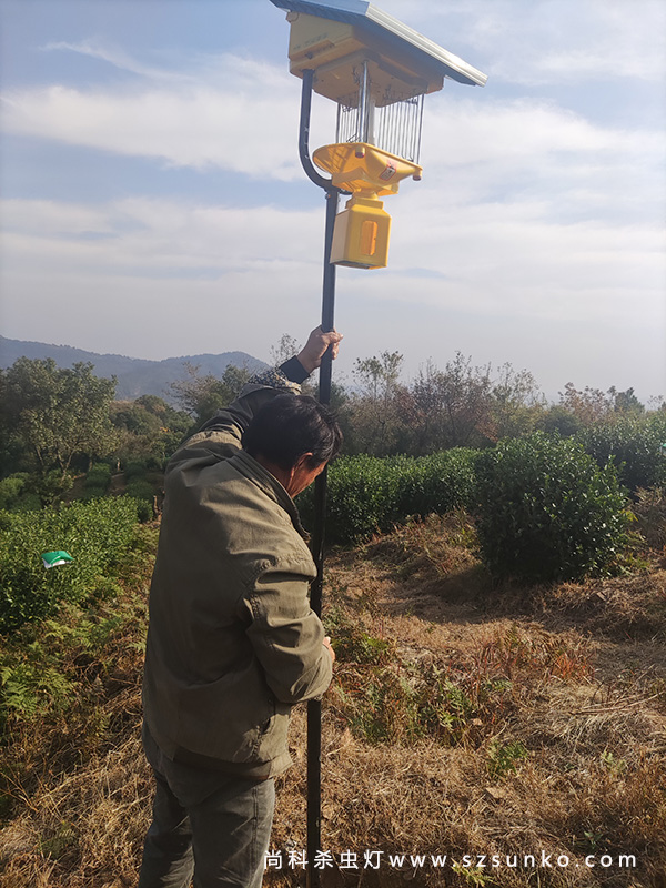 上圖:安裝好后的太陽能殺蟲燈,保護著茶園