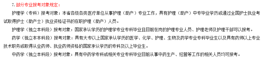 護(hù)理學(xué)(專科)、護(hù)理學(xué)(獨(dú)立本科段)、藥學(xué)(獨(dú)立本科段)、公安管理(本科段)、監(jiān)所管理(獨(dú)立本科段)等有特殊報(bào)考對象規(guī)定的專業(yè),報(bào)考條件如下圖所示。