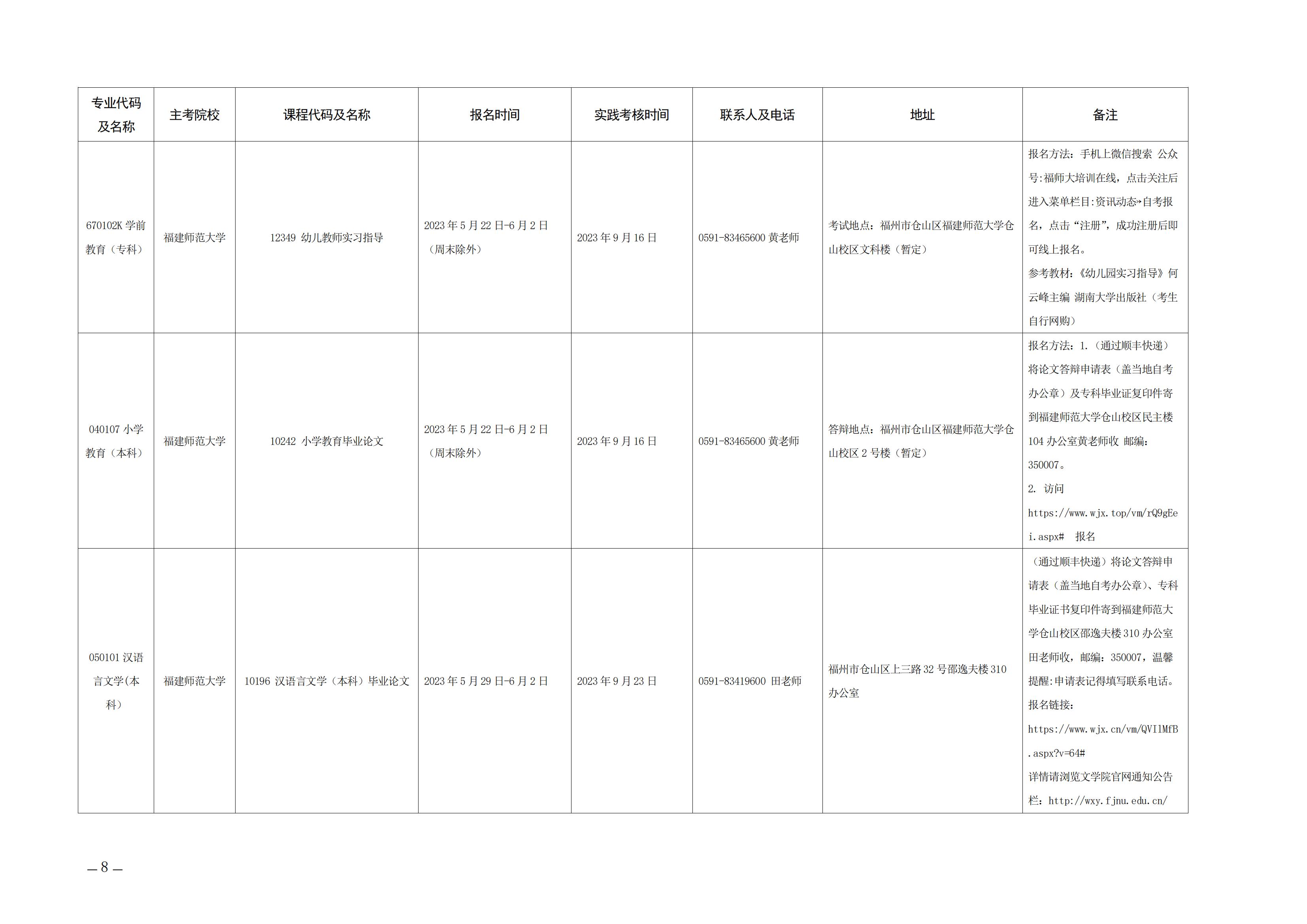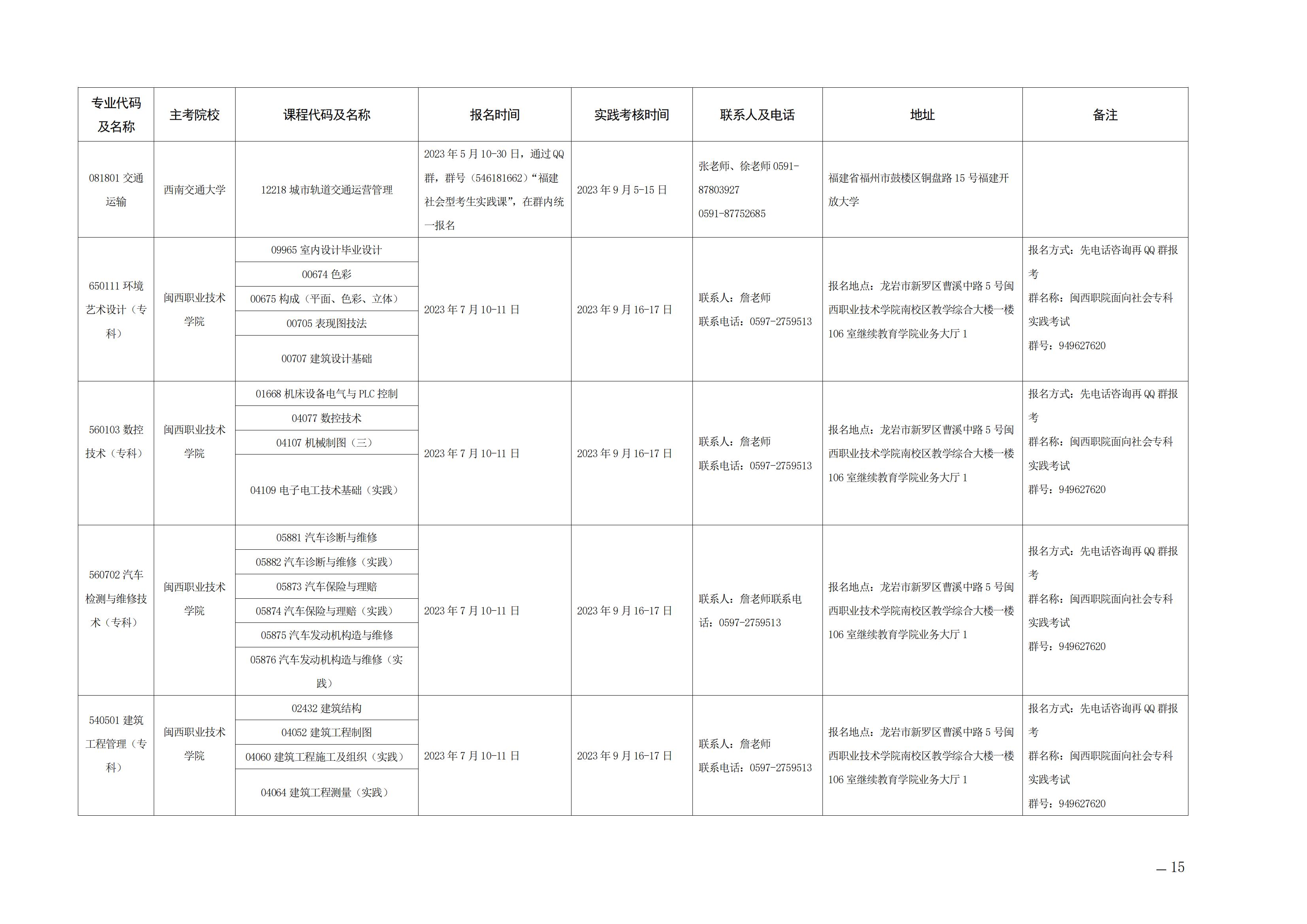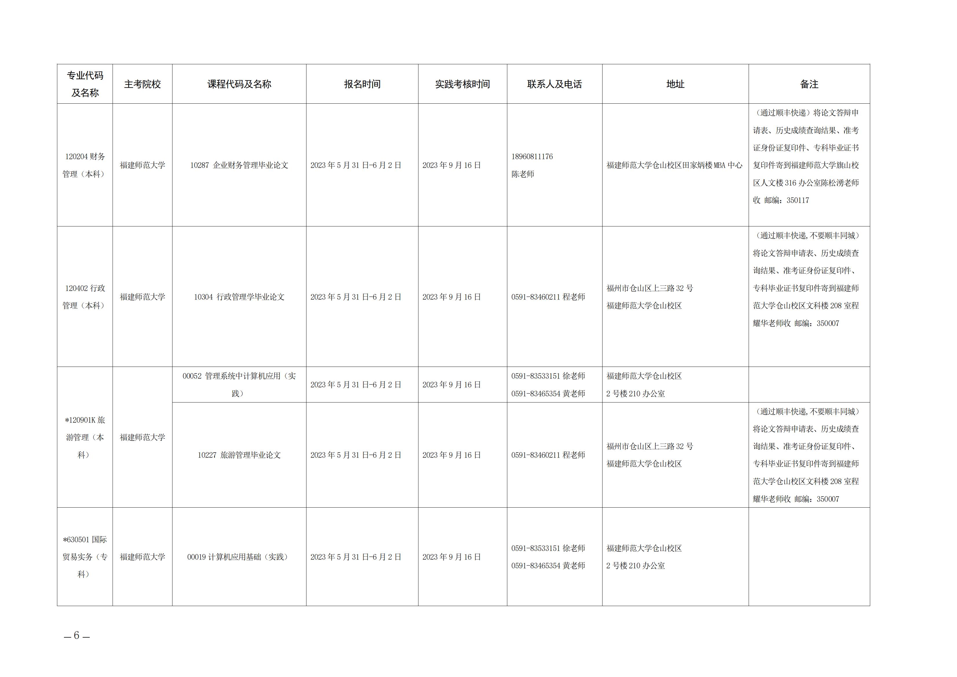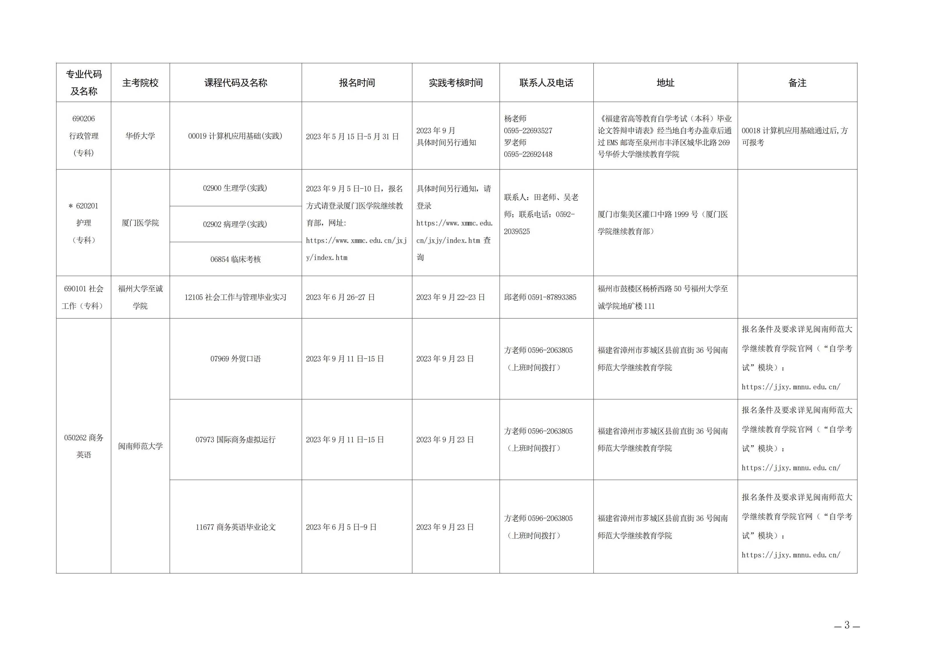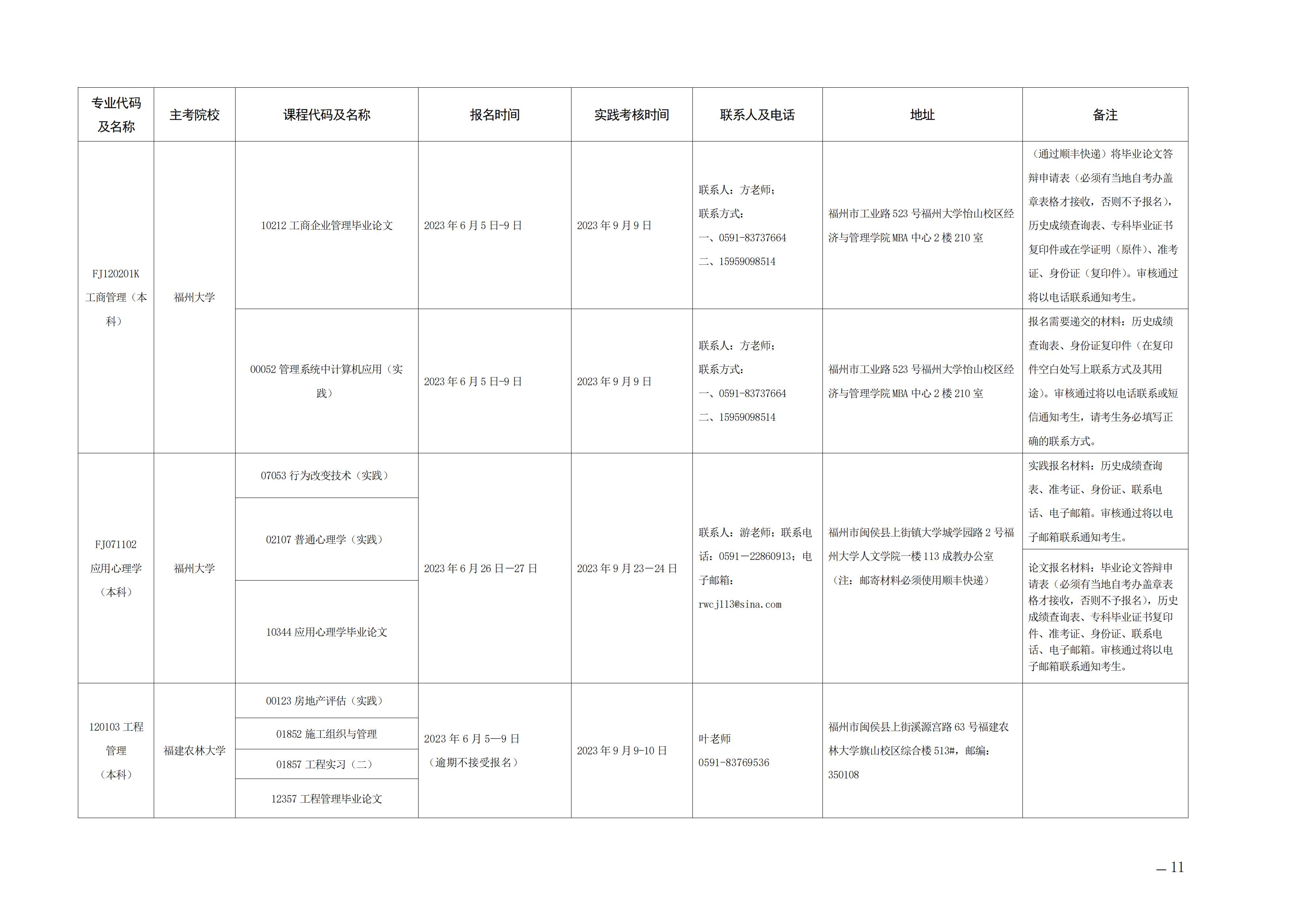 2023年下半年福建自考面向社會開考實踐性考核課程安排表