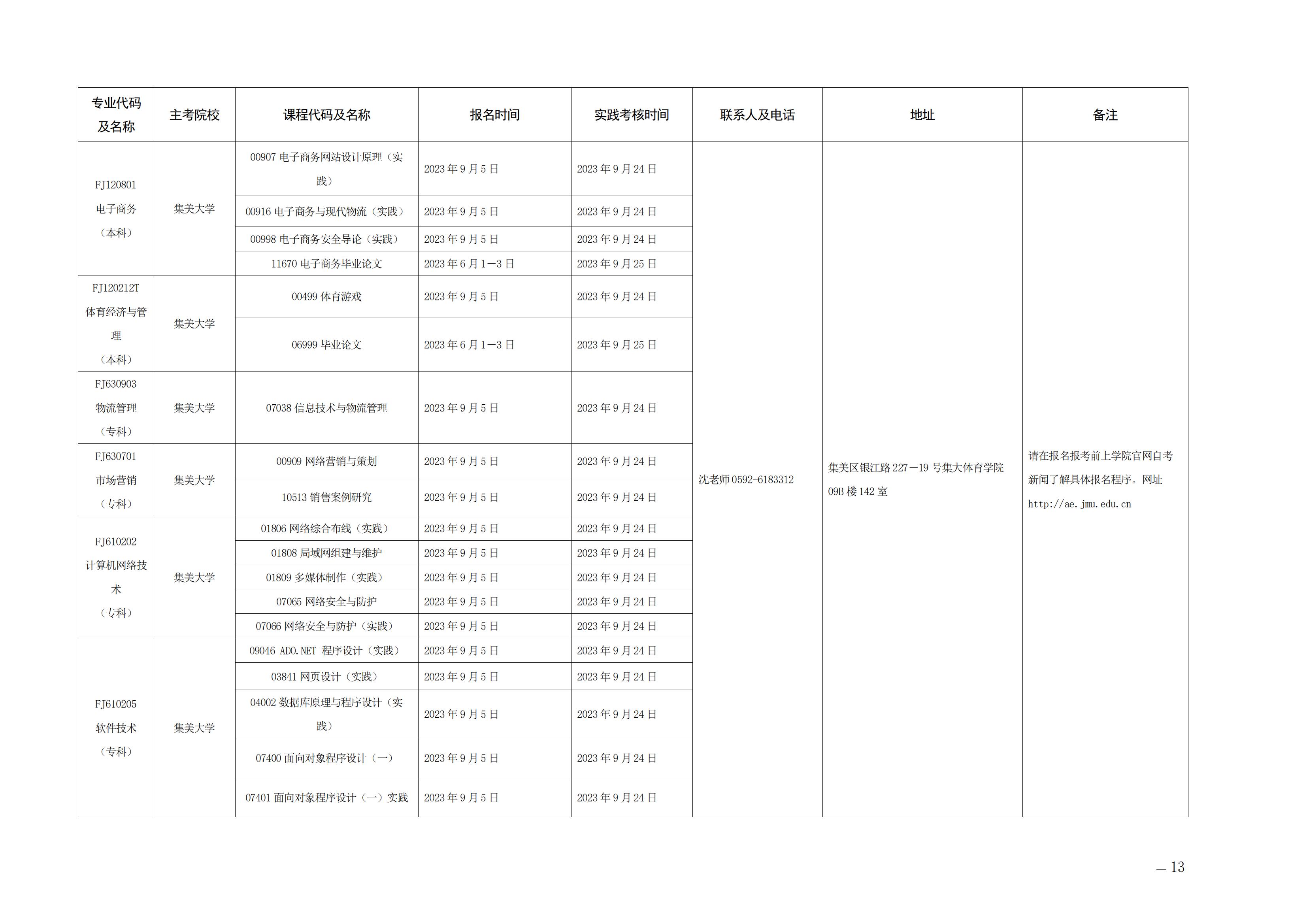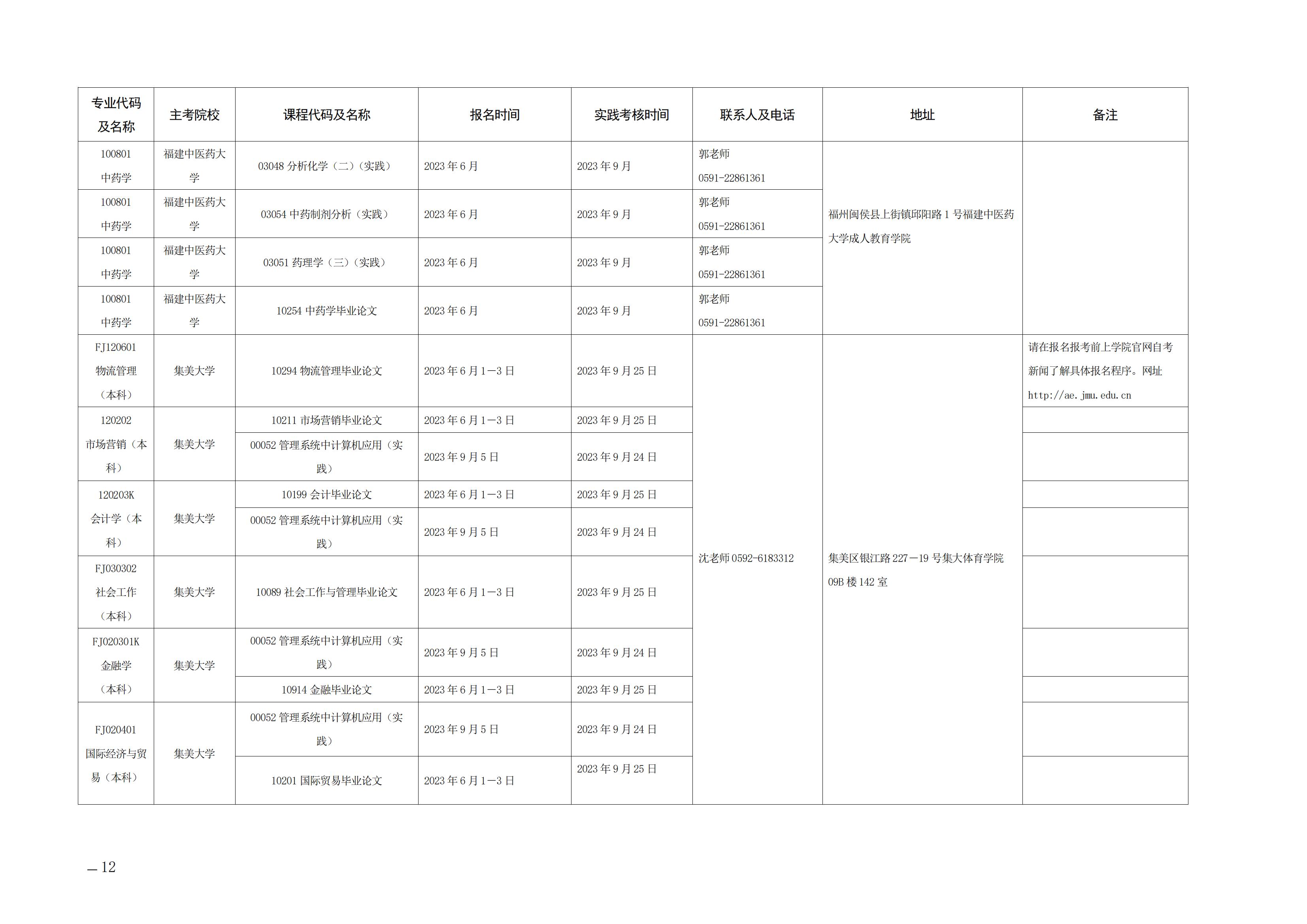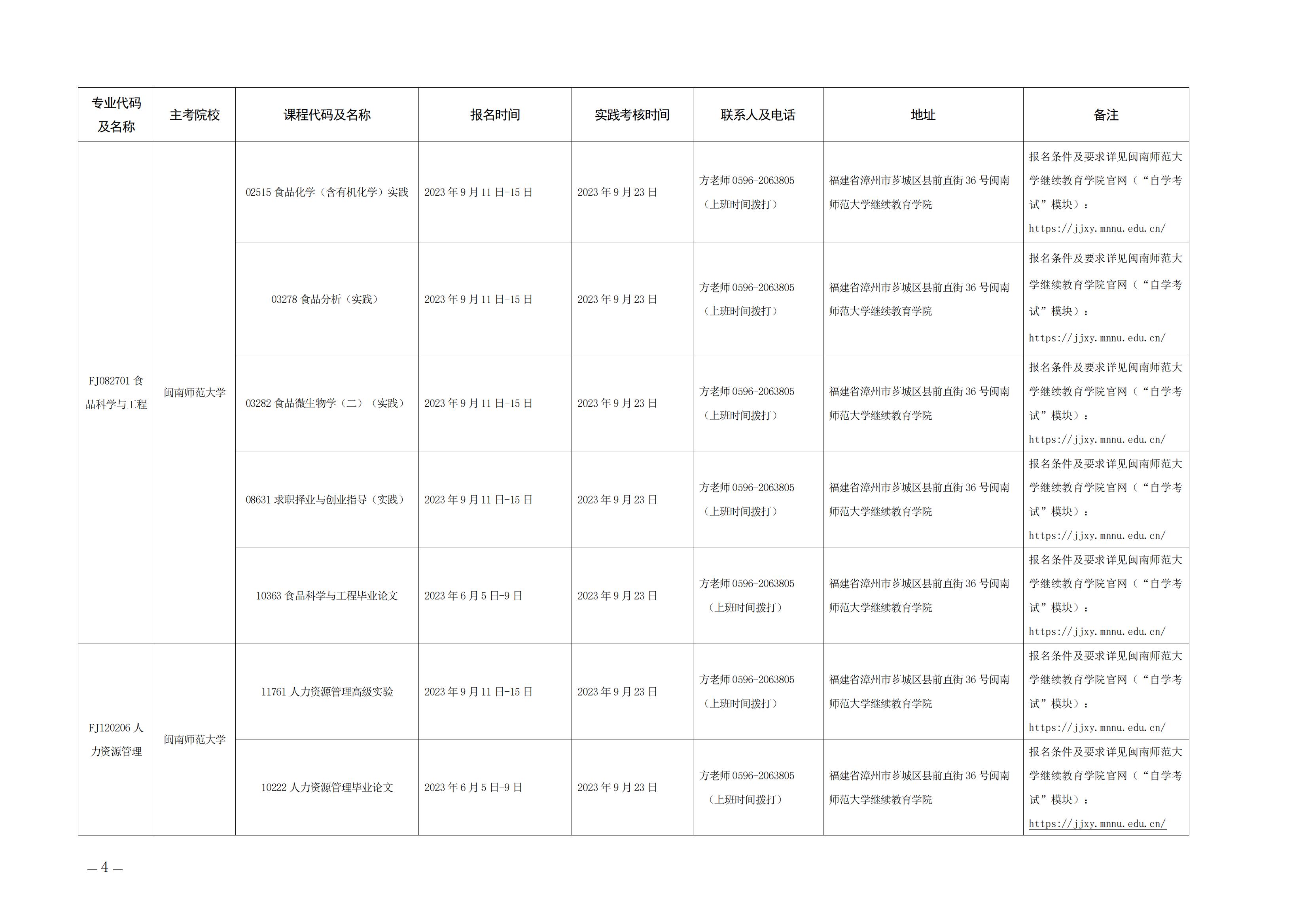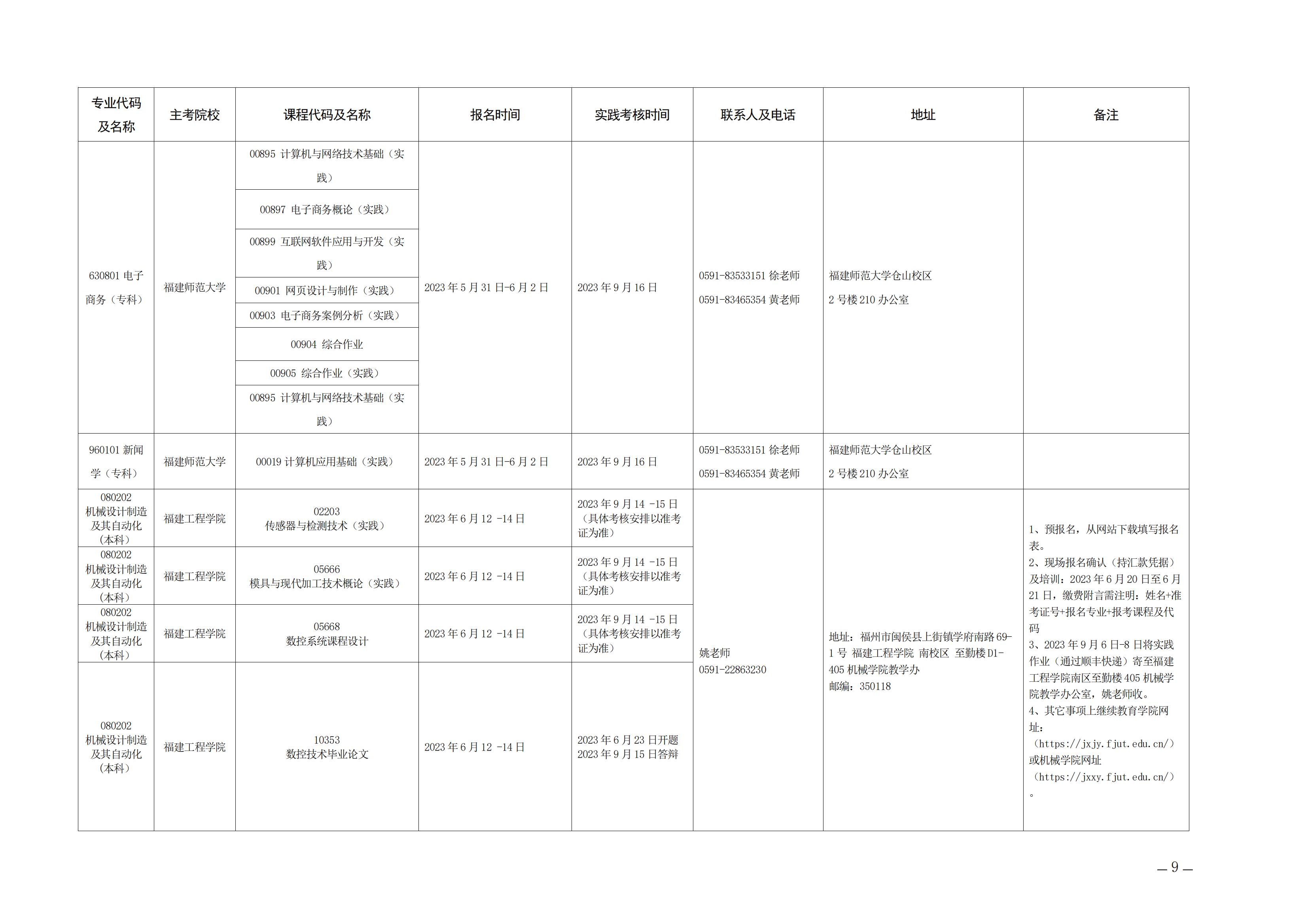 2023年下半年福建自考面向社會開考實踐性考核課程安排表