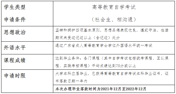 根據(jù)《廣東技術(shù)師范大學成人高等教育學士學位授予工作細則》(廣師大[2019]445號)文件規(guī)定,我校自考畢業(yè)生可于2022下半年申請成人高等教育學士學位,現(xiàn)將有關(guān)事項通知如下。