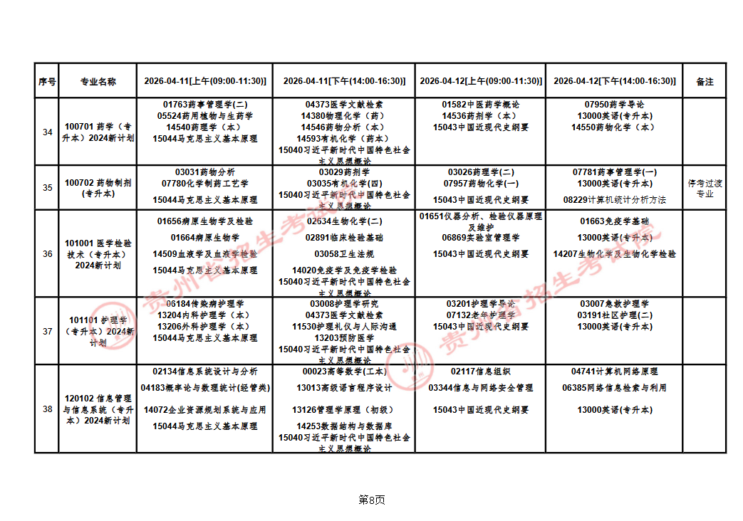 貴州省2026年上半年高等教育自學考試課程考試安排表