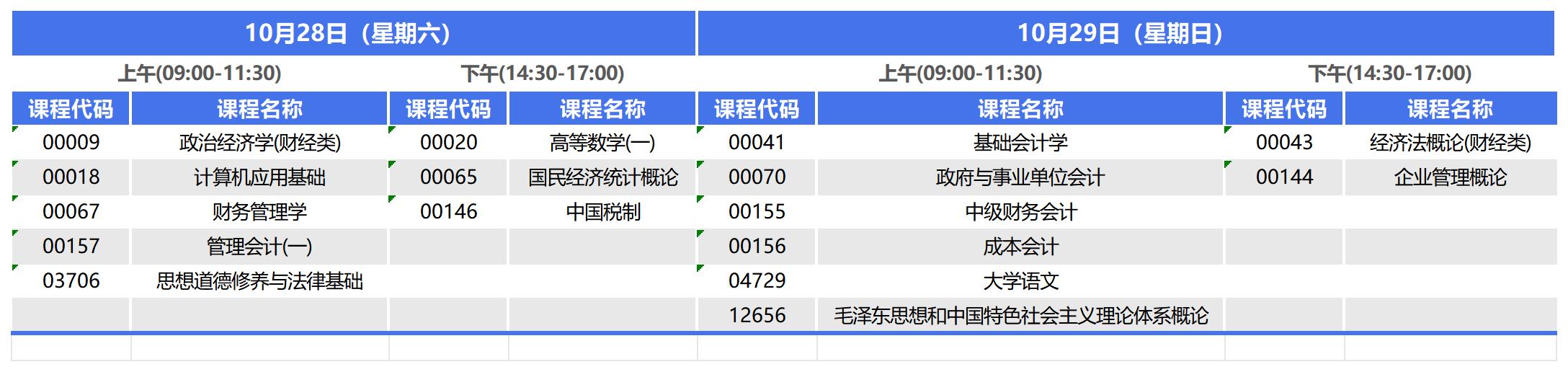 河北自考專科會計專業(yè),專業(yè)代碼630302(原專業(yè)代碼:020203),2023年10月自考考試時間為10月28日-29日,上午9:00-11:30,下午14:30-17:00,本次考期共開考16門課程,具體科目安排如下: