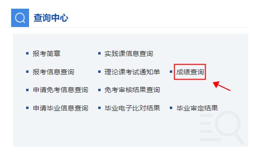 1、考生進(jìn)入河北高等教育自學(xué)考試網(wǎng)上信息系統(tǒng),點(diǎn)擊查詢中心下的“成績查詢”;
