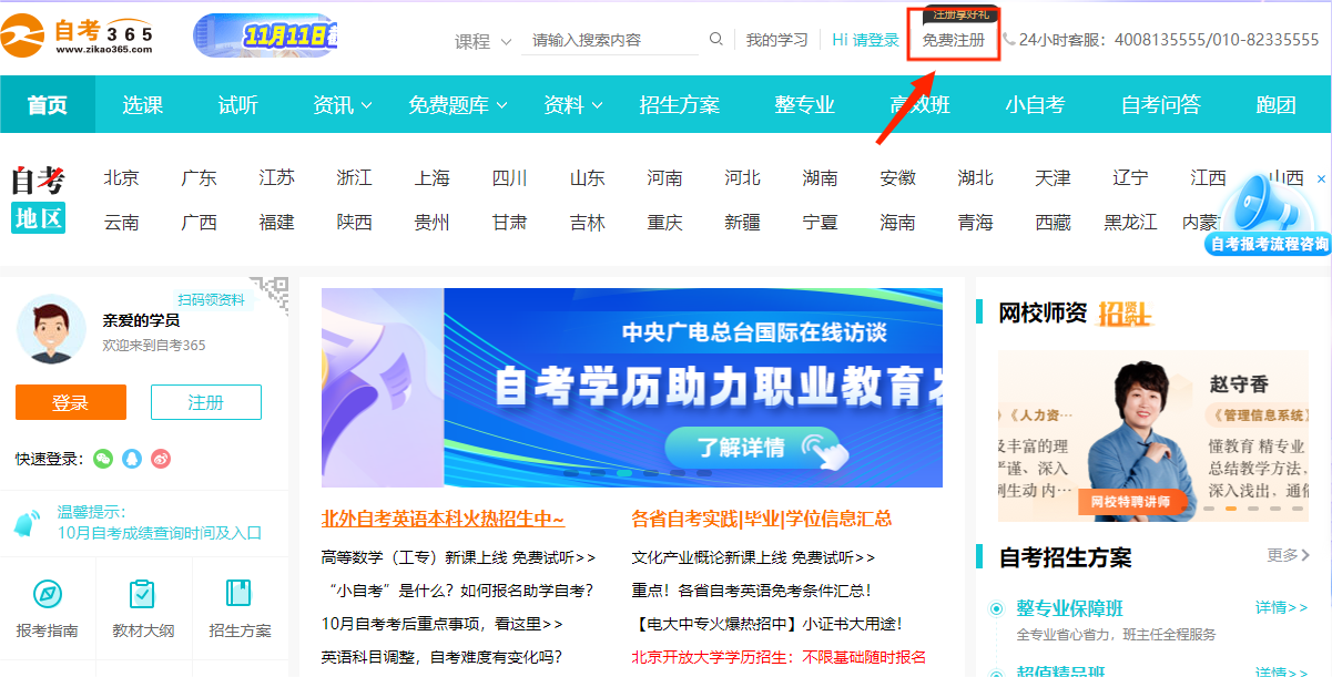 1進(jìn)入自考365網(wǎng)校網(wǎng)站首頁,在左上部點(diǎn)擊注冊(cè)按鈕,進(jìn)入注冊(cè)頁面。