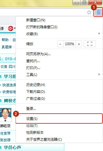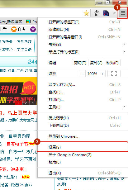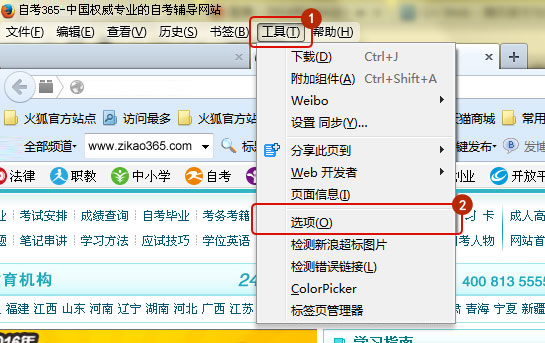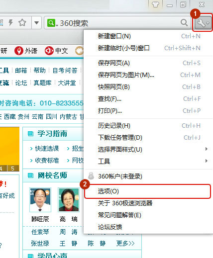 打開瀏覽器,先登錄到自考365的頁面(這步很重要),點擊右上角小扳手-選項,如圖所示: