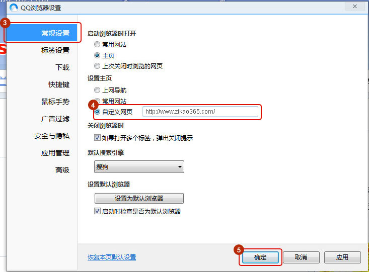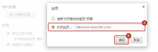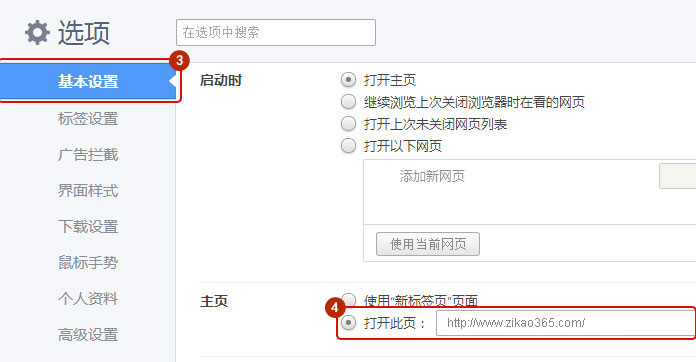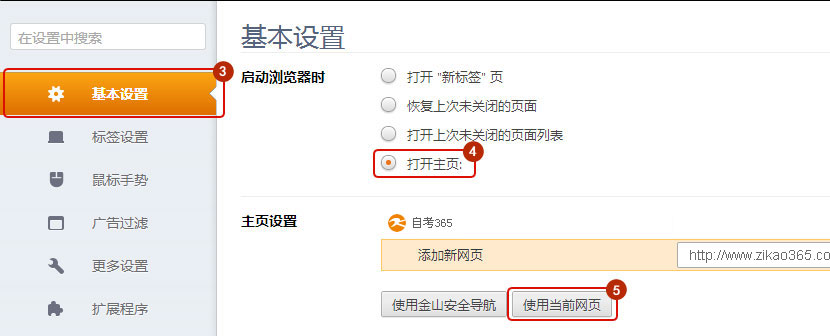 選擇常規(guī)設置選項, 勾選自定義網址,并輸入www.nbakt.cn, 點擊保存,就可以設定自考365為主頁了。