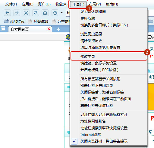 打開360瀏覽器, 工具(alt+t)-主頁設置,如圖所示: