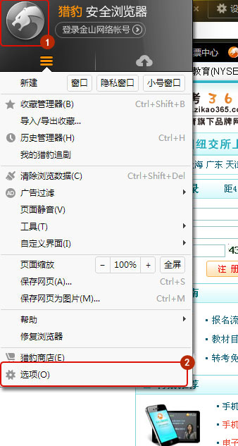 打開獵豹瀏覽器輸入并訪問 www.nbakt.cn后,點擊左上角豹頭>>選項。