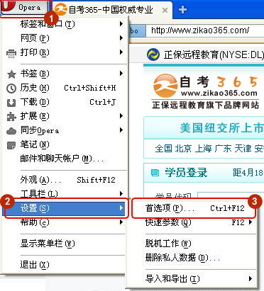 打開opera瀏覽器-左上角菜單-設置-首選項,如圖所示: