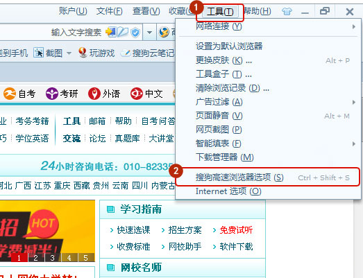 打開搜狗瀏覽器,點擊菜單里的工具 - 搜狗高速瀏覽器選項,如圖所示: