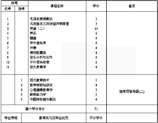 5、 其他專業(yè)的專科畢業(yè)生報考本專業(yè)時應加考:教育學(4學分)、心理學(4學分)、基本樂理(6學分)、視唱練耳(8學分)、聲樂(8學分)、鍵盤與和聲(二)(5學分)。