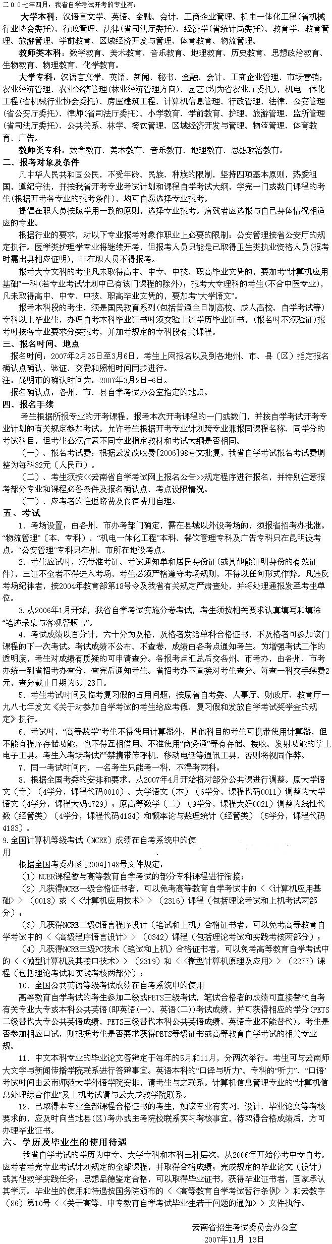 根據(jù)國(guó)務(wù)院頒布的《高等教育自學(xué)考試暫行條例》,結(jié)合我省實(shí)際,現(xiàn)公布“二00七年四月云南省自學(xué)考試報(bào)考簡(jiǎn)章”