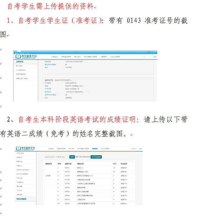 成人網(wǎng)絡(luò)自考學(xué)生請正確無誤非常清晰地上傳相關(guān)資料,若提供虛假資料后果自負(fù)。若有疑問可聯(lián)系考生本人的助學(xué)學(xué)校自考辦及主考學(xué)校自考辦。