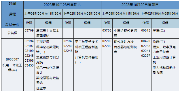 2023年10月湖南自考本科機(jī)電一體化工程專業(yè)(專業(yè)代碼:B080307)課程安排如下: