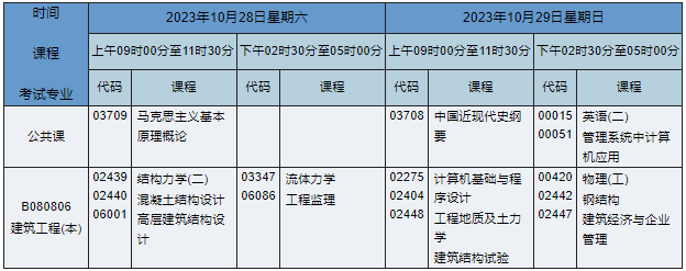 2023年10月湖南自考本科建筑工程專業(yè)課程安排表