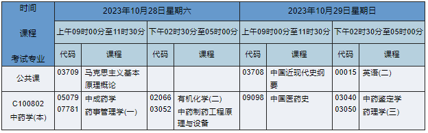 2023年10月湖南自考本科中藥學專業(yè)課程安排表
