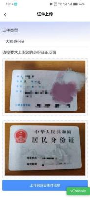 分別點(diǎn)擊頭像面、國(guó)徽面,彈出的下拉菜單可以選“拍攝”或“從相冊(cè)選擇”上傳身份證照片,上傳成功后,點(diǎn)擊下方的“上傳完成請(qǐng)核對(duì)信息”按鈕,打出如下圖所示窗口。