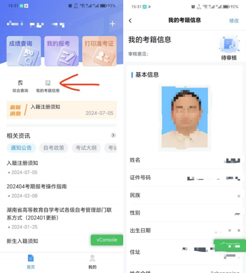 該界面可以查詢(xún)審核結(jié)果,入籍信息未審核前,可以點(diǎn)擊右上角“修改”按鈕,打開(kāi)修改考籍信息界面,如下圖所示。