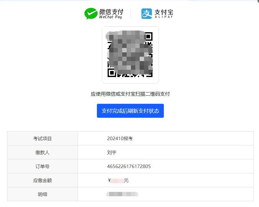 考生使用手機(jī)微信或支付寶掃描支付界面上的二維碼,按照提示支付所報(bào)考課程考試費(fèi),如下圖所示: