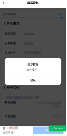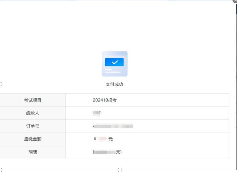 第六步報(bào)考確認(rèn)??忌瓿缮鲜霾僮骱螅c(diǎn)擊支付界面右上角“X”關(guān)閉按鈕。關(guān)閉支付界面后,可返回報(bào)考系統(tǒng)查看本次繳費(fèi)成功的報(bào)考課程信息(繳費(fèi)狀態(tài)為“已繳費(fèi)”),如下圖所示: