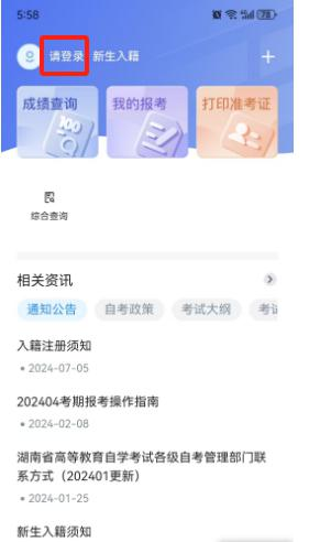 個(gè)人手機(jī)上,點(diǎn)擊安裝好的瀟湘自考 APP 圖標(biāo),進(jìn)入門(mén)戶(hù)首頁(yè),如下圖 1-2 所示,點(diǎn)擊左上角的“請(qǐng)登錄”連接,進(jìn)入登錄界面。