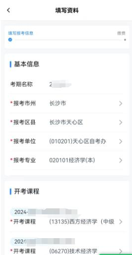 在“填寫(xiě)報(bào)考資料”界面,考生按要求選擇所報(bào)考的地區(qū)信息(報(bào)考市州和報(bào)考區(qū)縣)和報(bào)考專(zhuān)業(yè)信息,在所選的專(zhuān)業(yè)課程列表中選擇本次需要報(bào)考的理論課程。