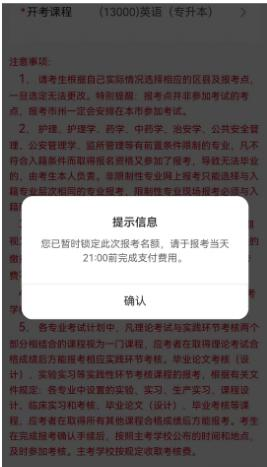 考生確認(rèn)報(bào)考信息無(wú)誤后,點(diǎn)擊右下角“下一步”,系統(tǒng)會(huì)出現(xiàn)“您已暫時(shí)鎖定此次報(bào)考名額,請(qǐng)于報(bào)考當(dāng)天 21:00 前完成支付費(fèi)用”提示信息,如下圖所示: