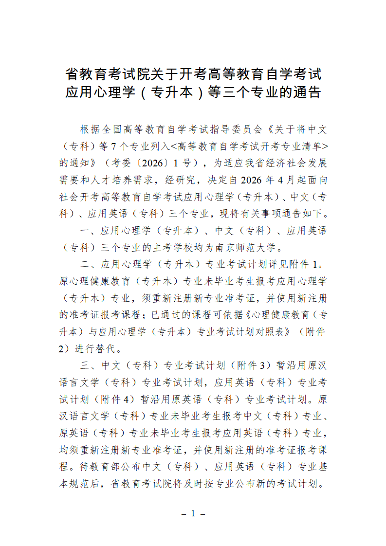 江蘇關(guān)于開(kāi)考自學(xué)考試應(yīng)用心理學(xué)(專升本)等三個(gè)專業(yè)的通告