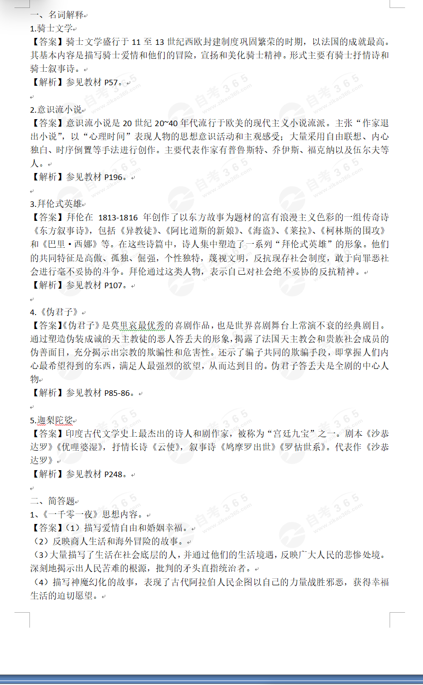 2025年10月自考外國文學史部分試題及答案(考友回憶版)