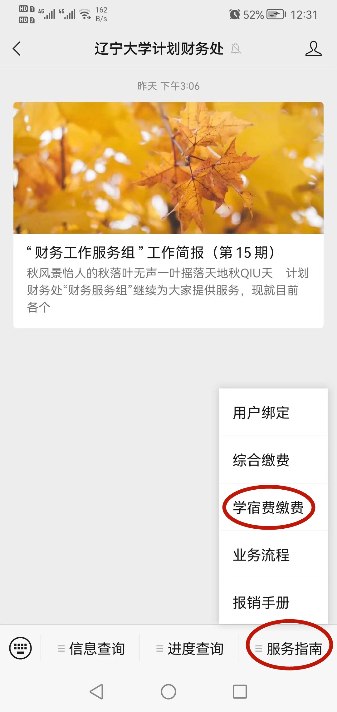 1.登錄微信,微信中搜索并關(guān)注“遼寧大學(xué)計劃財務(wù)處”微信公眾號。進入公眾號通過右下方“服務(wù)指南”,選擇“學(xué)宿費繳費”進入“校園統(tǒng)一支付平臺”登錄界面。登陸網(wǎng)址http://xysf.lnu.edu.cn/xysf/可直接進入“校園統(tǒng)一支付平臺”登錄界面。