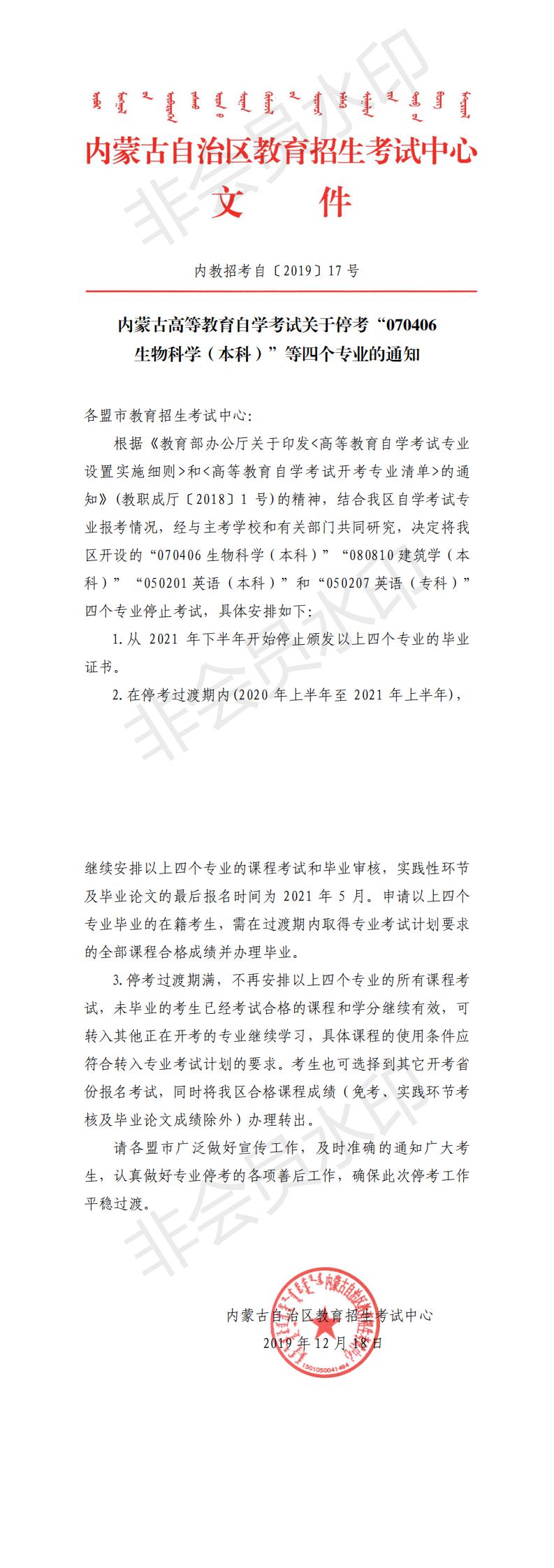 內(nèi)蒙古自考??肌?70406 生物科學(xué)(本科)”等四個專業(yè)的通知