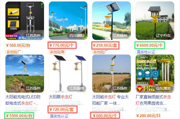 上圖來(lái)自百度搜索首頁(yè)截圖,共有8個(gè)殺蟲燈產(chǎn)品,其中4個(gè)紅框標(biāo)記的太陽(yáng)能殺蟲燈報(bào)價(jià)都是偏低的,當(dāng)你真正購(gòu)買時(shí)是不存在的。綠色標(biāo)記出來(lái)的兩個(gè)殺蟲燈報(bào)價(jià)是偏高的。總之,殺蟲燈圖文和報(bào)價(jià)都是不相符的——有問題的殺蟲燈報(bào)價(jià)占比達(dá)到75%。