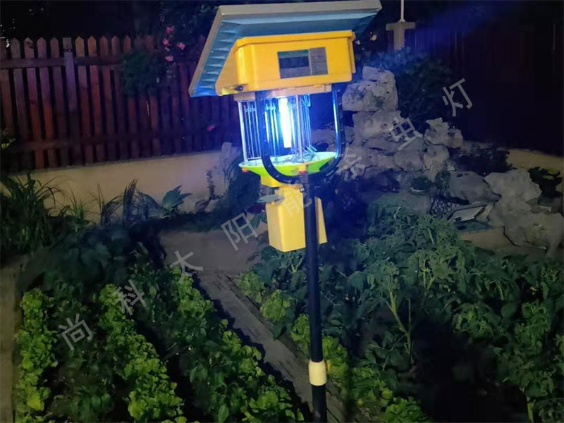 上圖:尚科TFS10太陽能殺蟲燈發光的圖片,光源顏色偏藍色,應用場景菜地
