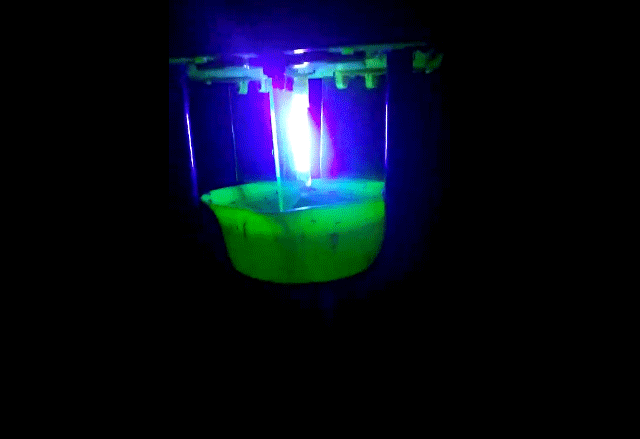 上圖:水淹式太陽能殺蟲燈發光的圖片,實際是弱紫光,拍出來后會有藍光反射。