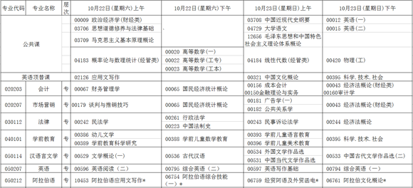 寧夏2016年10月自學考試專業(yè)課程時間表