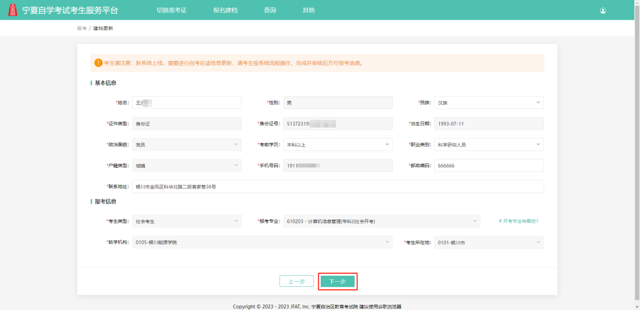 考生完成信息更新后,請(qǐng)?jiān)俅未_認(rèn)信息,確認(rèn)無誤后點(diǎn)擊“下一步”。