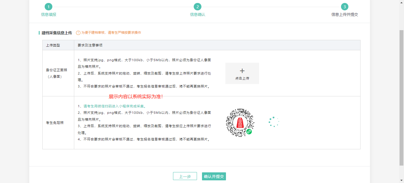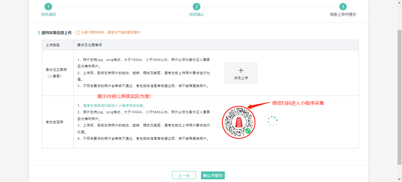 信息上傳并提交進(jìn)入信息上傳并提交頁(yè)面后,考生請(qǐng)按要求,上傳身份證正面照片、使用微信掃碼進(jìn)入小程序完成免冠照片采集。