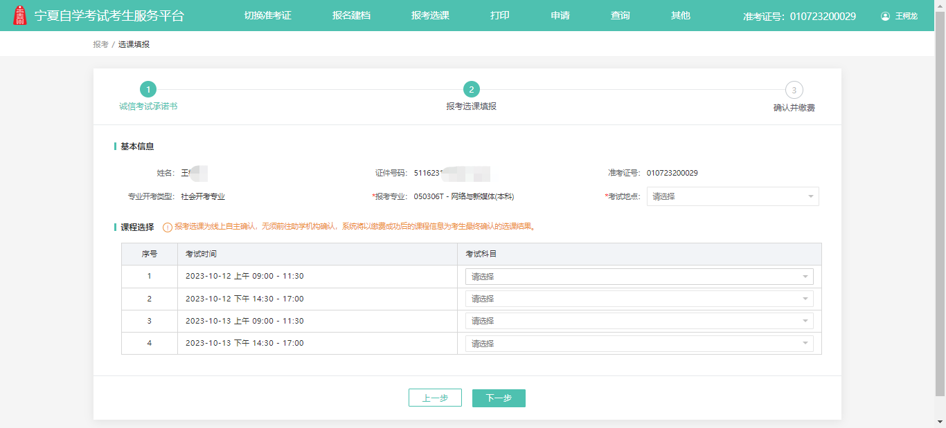 在報(bào)考選課頁(yè),點(diǎn)擊“我要報(bào)考”進(jìn)入下一步,滾動(dòng)閱讀框并勾選“我已閱讀并知曉誠(chéng)信考試承諾書,并予以遵守。”完成后點(diǎn)擊“下一步”。