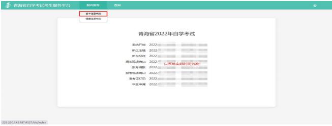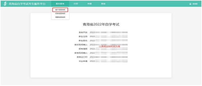 進入青海省自學(xué)考試考生服務(wù)平臺,找到頁面上方“報名報考”并在彈出的菜單中選擇“基本信息填報”。