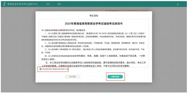 在彈出的考生須知頁面中勾選“我已閱讀并同意《青海省自考考生須知》”點擊“同意并繼續(xù)”。