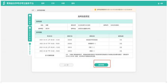 【報考信息預(yù)覽】請考生認真核對報考信息和報考課程相關(guān)信息,確認信息無誤后,點擊“確認并提交審核”。請注意:本次報考采取網(wǎng)上報考確認的方式,不需要到現(xiàn)場確認。